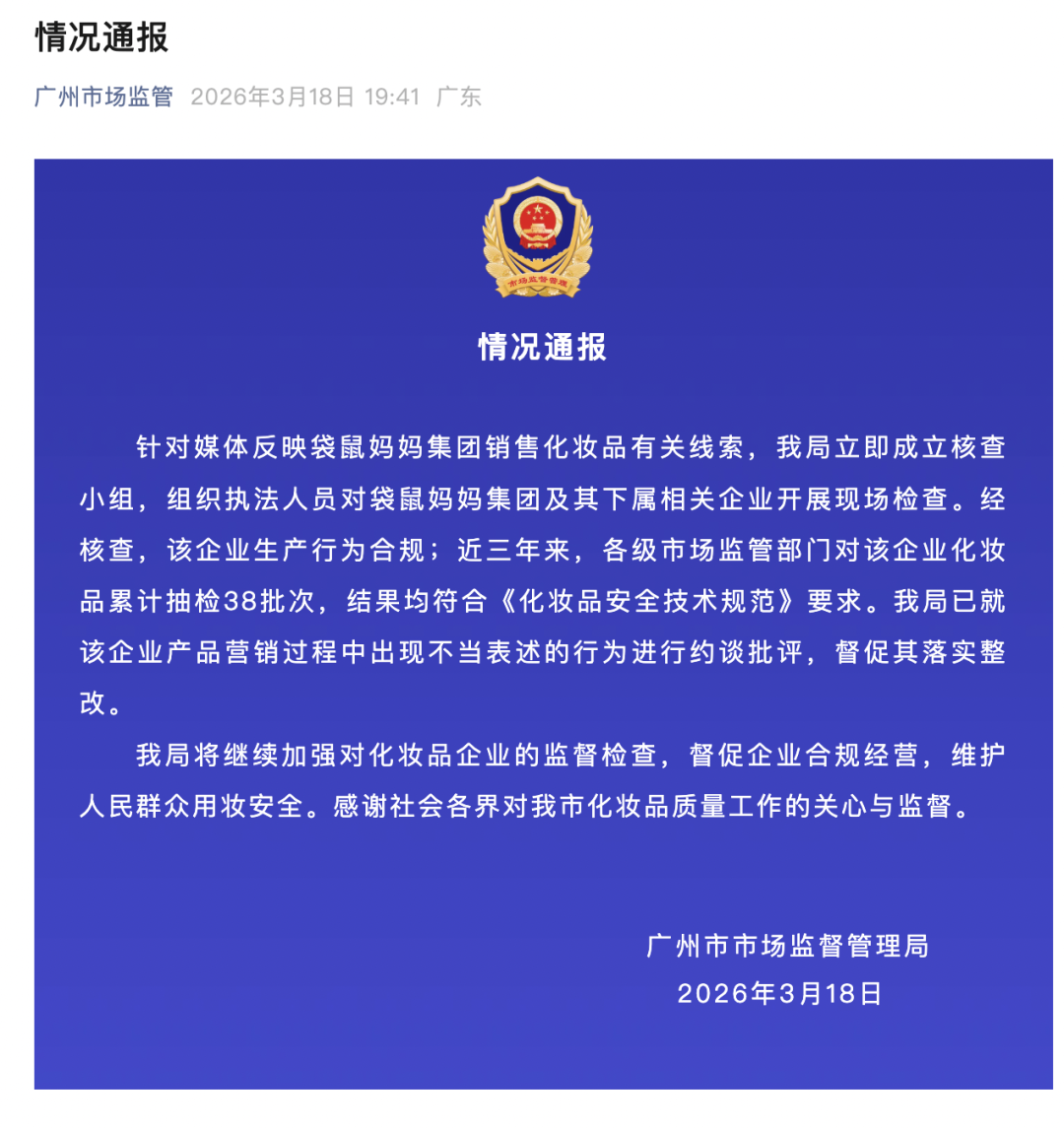 3月18日,广州市市场监督管理局通报:针对媒体反映袋鼠妈妈集团销售化妆品有关线索,该局立即成立核查小组,组织执法人员对袋鼠妈妈集团及其下属相关企业开展现场检查。经核查,该企业生产行为合规;近三年来,各级市场监管部门对该企业化妆品累计抽检38批次,结果均符合《化妆品安全技术规范》要求。该局已就该企业产品营销过程中出现不当表述的行为进行约谈批评,督促其落实整改。